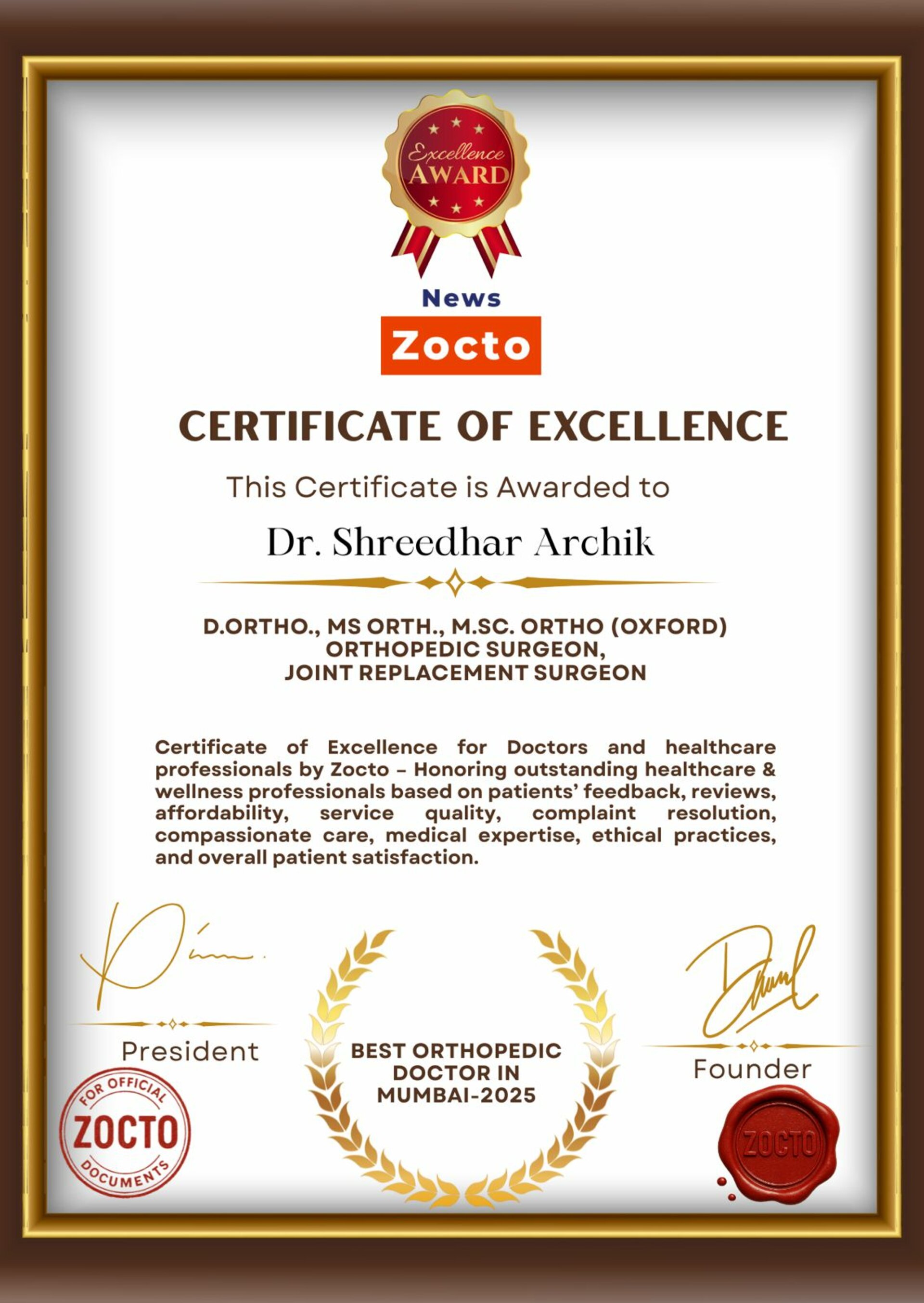 Dr. Shreedhar Archik, a renowned Orthopedic Surgeon, has been honored with a Certificate of Excellence in recognition of his outstanding contributions and dedication to the field of orthopedics. This prestigious acknowledgment reflects his commitment to advancing medical care, clinical excellence, and patient well-being. His expertise and continued efforts in delivering high-quality orthopedic treatment have earned him immense respect within the medical fraternity.